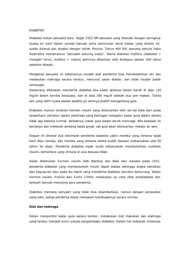 Diabetes from imgv2-2-f.scribdassets.com Bila kadar gula darah normal manusia tidak sesuai dengan kadar gula darah anda bisa jadi anda sedang mengalami masalah penyakit gula. Menjaga kadar gula darah agar tetap berada dalam batas normal adalah hal yang penting. Angka berikut hanya berupa estimasi kisaran yang dapat digunakan sebagai panduan. Anda dikatakan mengalami hiperglikemia jika kadar gula darah anda lebih dari 200 mg/dl. Jika kadar gula darah anda melebihi 350 mg/dl, gejala yang akan anda rasakan seperti perasaan mudah gelisah, tingkat kesadaran menurun, sangat kehausan, penglihatan tidak jelas, dan pusing. Gula darah atau glukosa adalah molekul yang ditemukan dalam darah. Menyeimbangkan kadar gula ini sangat penting, jika gula darah kurang (hipoglikemia) dan atau tinggi akan menyebabkan (hiperglikemia) maka akan menyebabkan beberapa implikasi penyakit lainnya. Gula darah terlalu rendah (hipoglikemia) atau tinggi (hiperglikemia) bisa berdampak negatif pada tubuh anda.